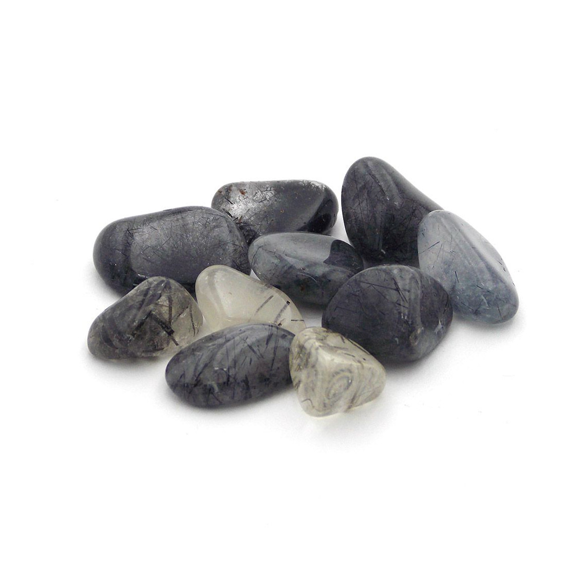 • Forme et aspect : Roulé, cristal de roche transparent avec des inclusions de tourmaline noire