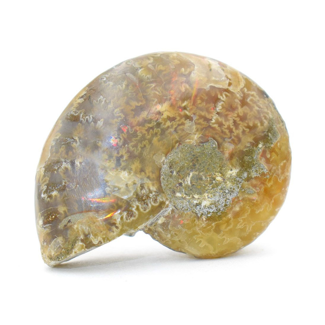 - Couleur : base marron avec des reflets irisés multicolores principalement verts et rouge faisant penser aux reflets de l'opale, d'où sont nom Ammonite opalisée