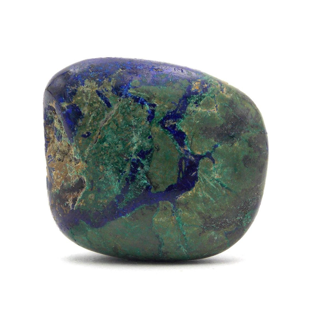 - Forme et aspect : Pierre roulée composée d'azurite (bleu foncé) et de malachite (vert foncé), aucune stabilisation n'a été effectuée.